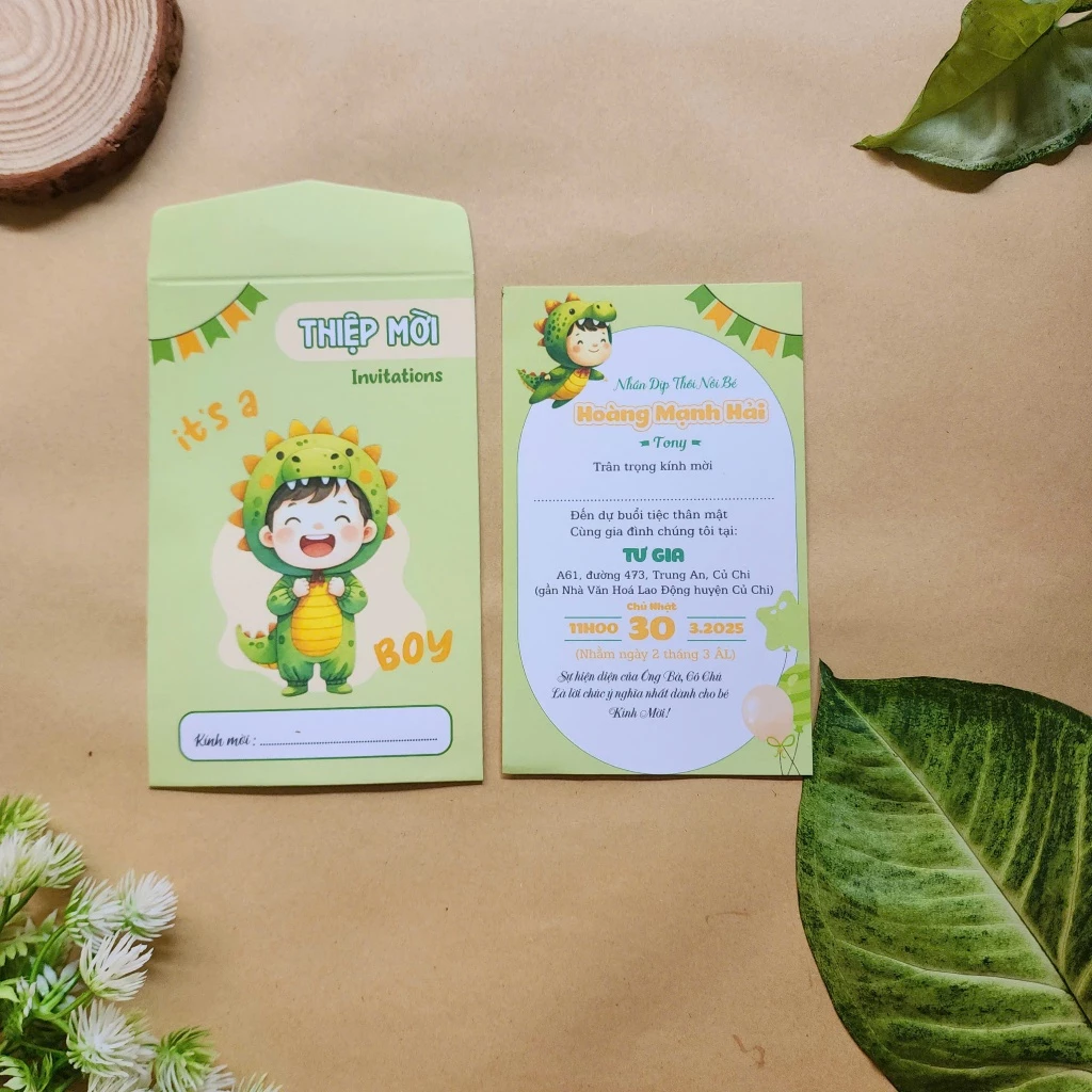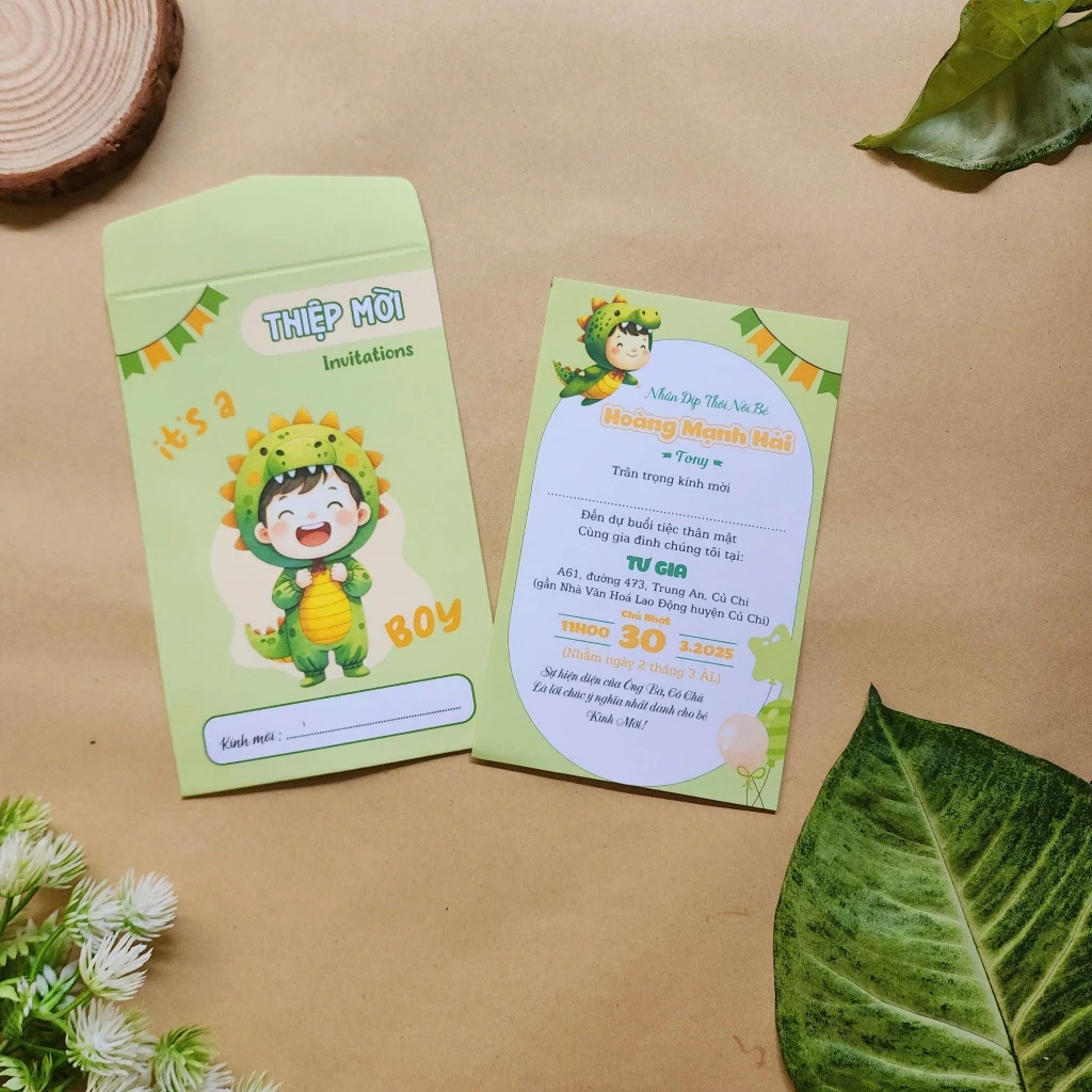 **Ba mẹ đặt hàng vui lòng nhắn thông tin in thiệp (Tên bé, ngày giờ và địa chỉ đãi tiệc) để shop lên mẫu xem trước khi duyệt**